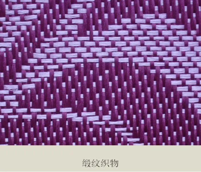 缎纹:每间隔四根以上的纱线才发生一次经纱与纬纱的交错,且这些交织点为单独的、互不连续的、均匀分布在一个组织循环内。织物表面具有较长的经向或纬向的浮长线